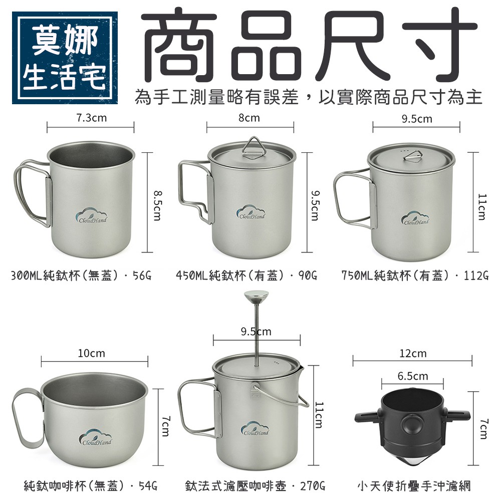 * 款式: 300ml 純鈦杯-斜柄(無蓋) / 450ml 純鈦杯-直角柄(帶蓋) /